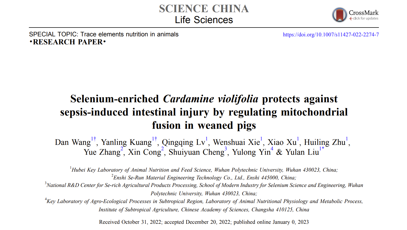 本网讯 近日,best365英国体育在线刘玉兰教授团队在中国优秀学术期刊《SCIENCE CHINA Life Sciences》(影响因子10.372,中科院1区top期刊)在线发表题为“Selenium-enriched Cardamine violifolia protects against sepsis-induced intestinal injury by regulating mitochondrial fusion in weaned pigs”的研究论文(论文链接:https://www.sciengine.com/SCLS/doi/10.1007/s11427-022-2274-7)。该论文揭示了富硒堇叶碎米荠在缓解脂多糖(LPS)诱导的仔猪肠道损伤中的作用和分子机制,为其在仔猪生产中的应用提供了重要的理论基础。