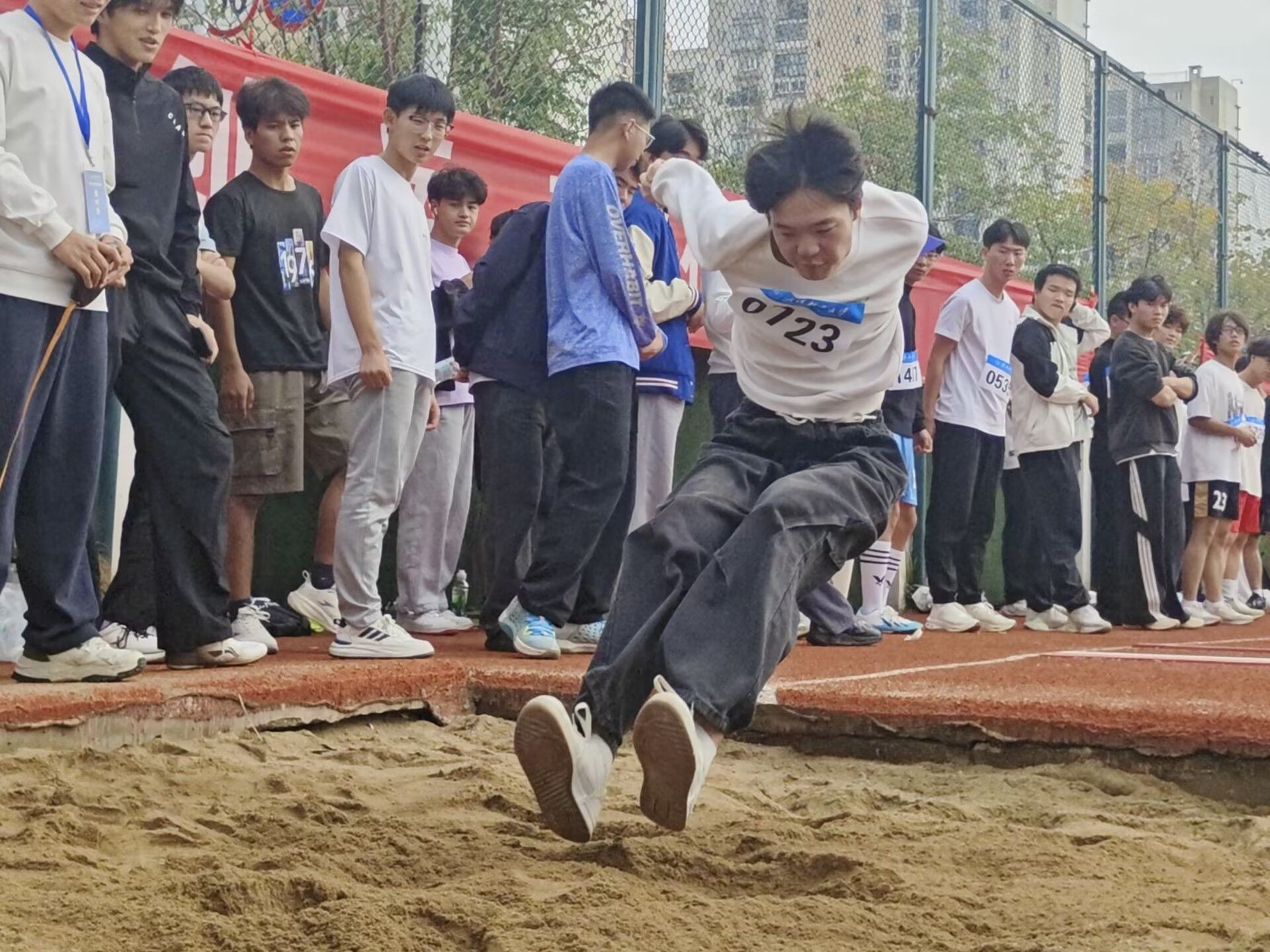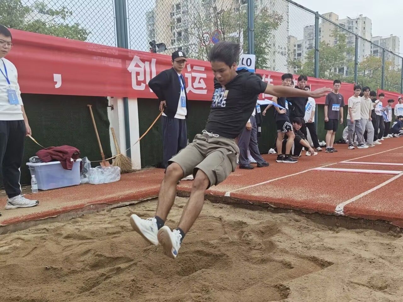 跳远赛场,选手们攒足力气助跑,起跳后在空中全力舒展身体,在沙坑上留下清晰的脚印。