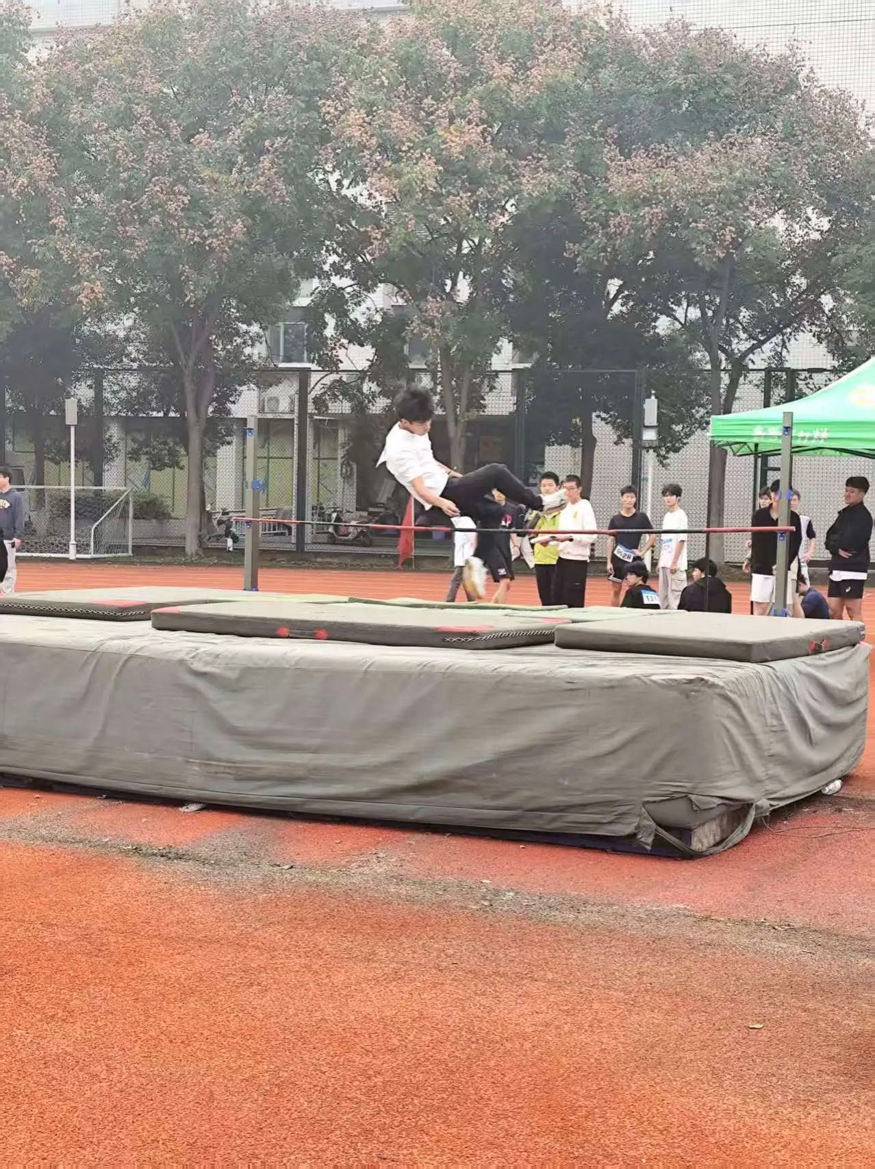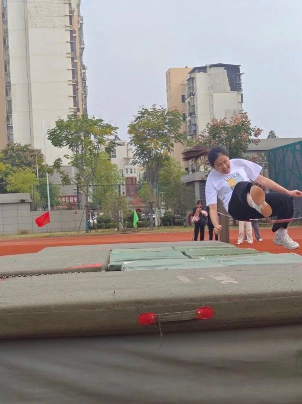 跳高场地上,运动员助跑后一跃而起,身体在空中划出轻盈弧线,越过横杆时衣角微扬。