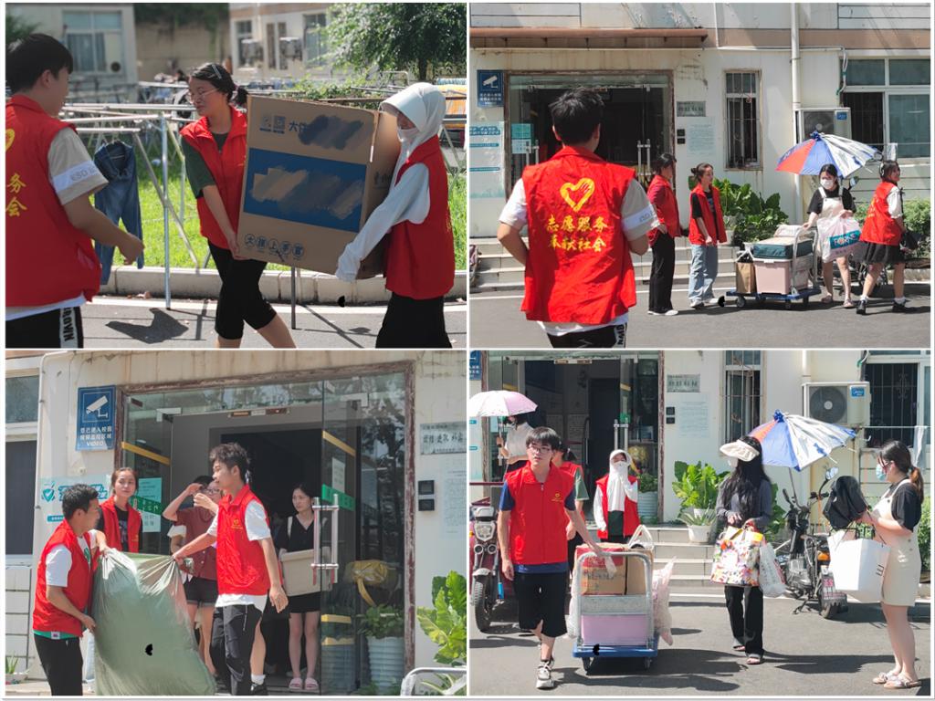 志愿者们身穿红色马甲,在楼梯间来回接力地搬行李,纵使天气炎热、汗流浃背也没能阻挡志愿者们的热情。