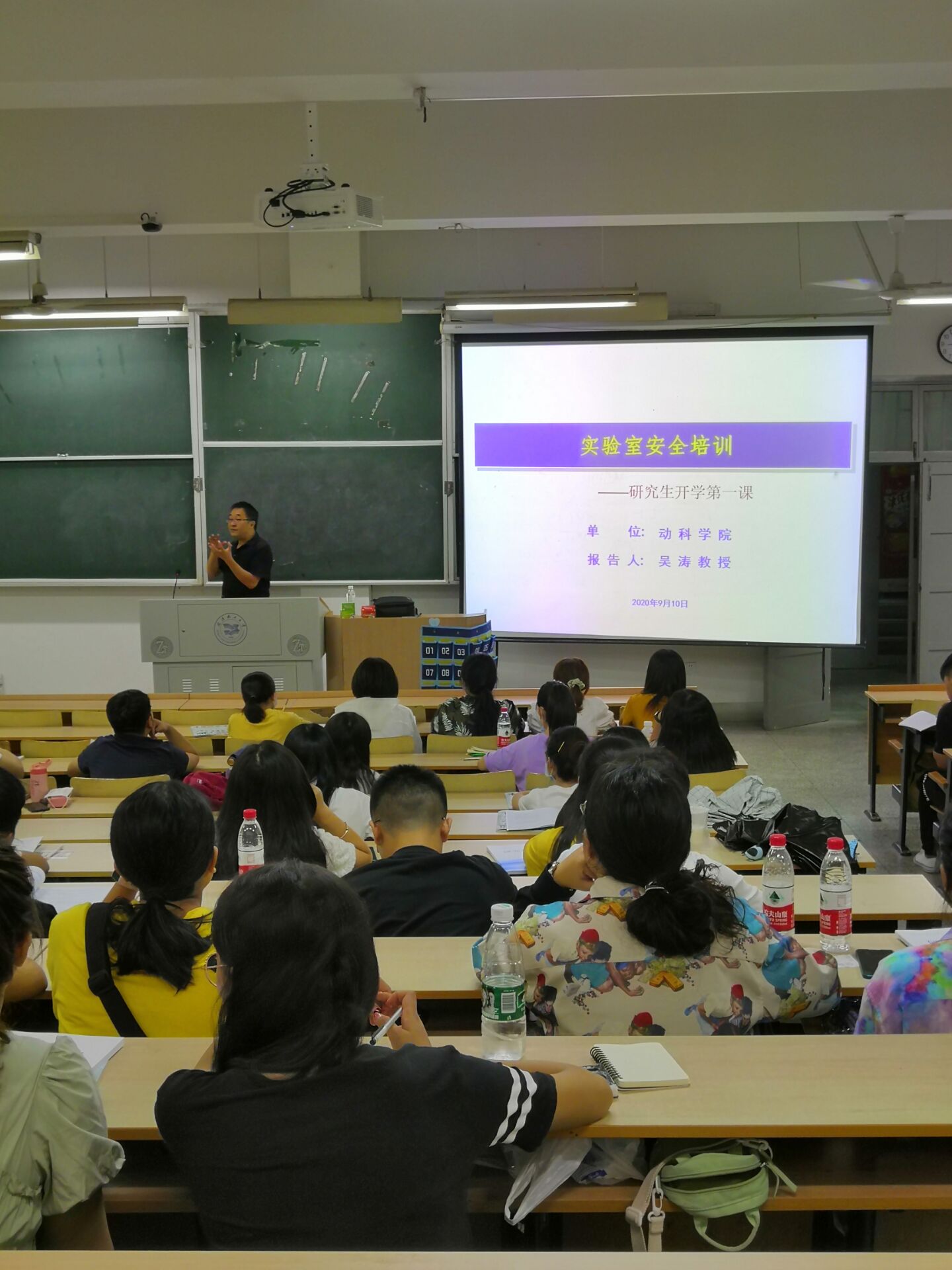 9月10日上午,动科公司在02-108教室举办了实验室安全主题教育活动。活动由动科公司经理助理吴涛教授主讲,全体2020级动科公司研究生新生参加实验室安全培训。