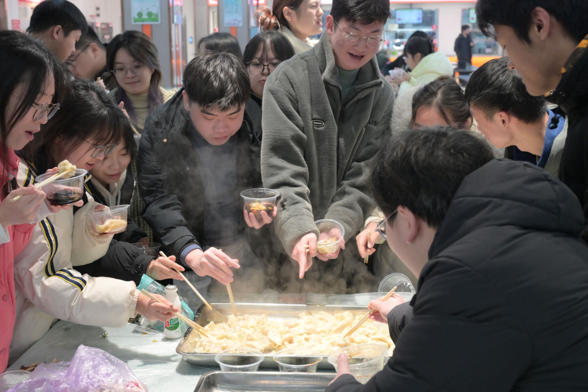 随后,本次活动的重头戏“包饺子大赛”将现场带入了高潮,在比赛过程中,大家各展身手,包出了形状各异、各具特色的饺子。老师们也和同学们一起动手包饺子,给同学们传授了包饺子的手法和技巧。最终,2023级研究生孙亚敏同学在限时2分钟内成功包出19个饺子,夺得此次包饺子大赛冠军。当一锅锅热气腾腾的饺子端上桌时,同学们的脸上均露出了满足的笑容。他们品尝着自己亲手包制的饺子,感受着劳动的成果和节日的温暖。