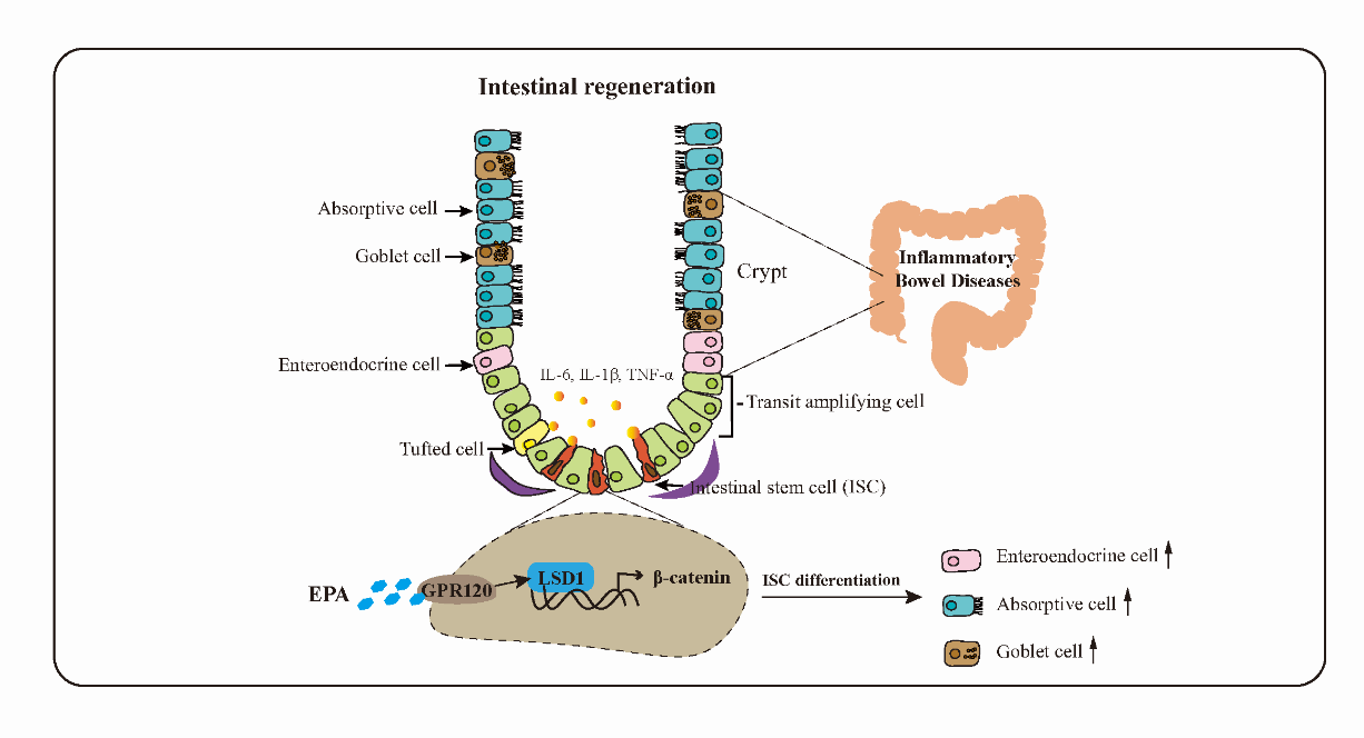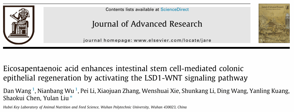 2024年12月30日,best365英国体育在线刘玉兰教授团队在Journal of Advanced Research(中科院1区,IF=11.4)杂志发表了题为“Eicosapentaenoic acid enhances intestinal stem cell-mediated colonic epithelial regeneration by activating the LSD1-WNT signaling pathway”的研究论文,解析了n-3多不饱和脂肪酸调控肠道干细胞命运促进肠道再生的分子机制。