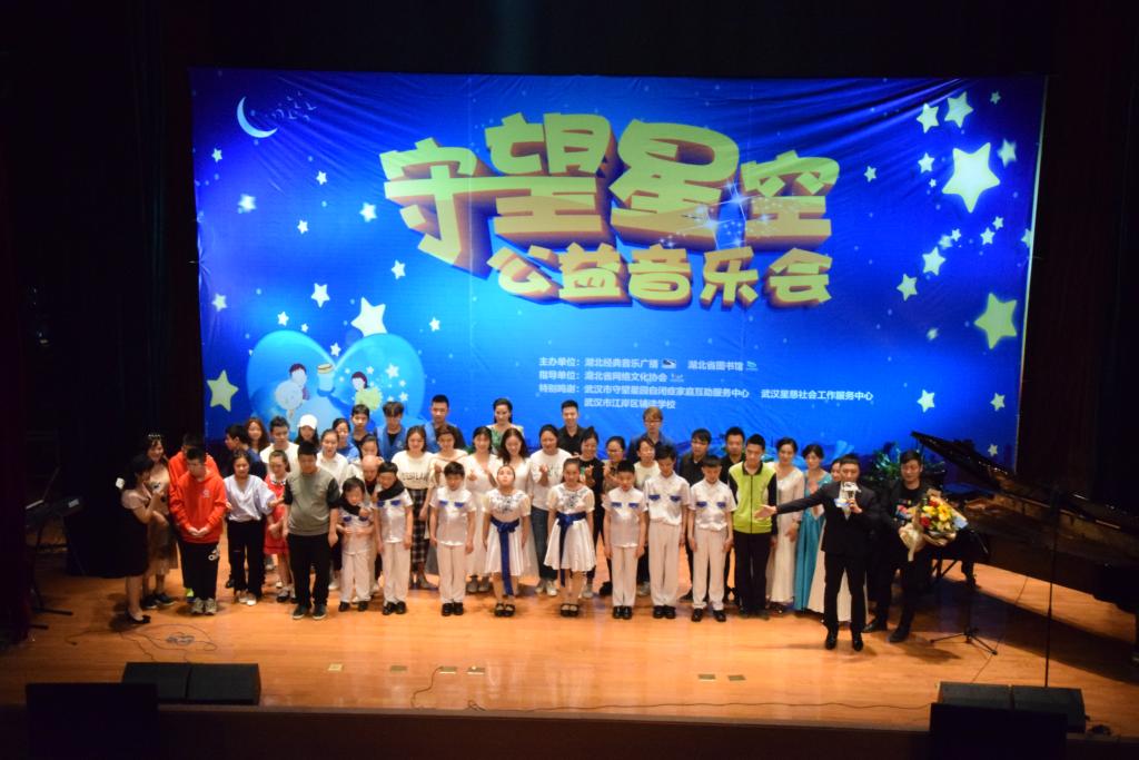 下午6时50分,26名志愿者和康乐家的孩子、家长到达湖北省图书馆一楼。据了解,本次活动主办单位是湖北经典音乐广播和湖北省图书馆,应邀而来的是各高校志愿服务团队及孤独症患者家庭。活动以歌舞、演唱、朗诵等形式开展,参演人员有自闭症儿童、家长、社会爱心人士、高校志愿者等。这个活动可以展示出自闭症儿童的才艺,自闭症儿童虽然有一些社交、沟通、行为等方面的不足,但经过长期的治疗和锻炼,他们是可以上台演奏钢琴、葫芦丝、陶笛、架子鼓、唱歌、跳舞的,还会做点心。此次活动的目的不仅是展现自闭症儿童和家长的努力成果,也希望社会能够给这些星星之子提供一个工作岗位。活动中有个节目是星之子的父母上台讲述他们的经历,他们说“孩子这个样子他们很痛心,但是陪伴他们一生是一种责任,这一路再苦再累也要咬牙坚持下去。”父母们担心孩子以后会不会挨饿,会不会被欺负,只愿百年之后孩子们能够活得有尊严,希望社会能有他们的一席之地。一首《隐形的翅膀》手语舞演绎了所有星之子家庭的心声,‘带我,飞过绝望’,愿洁白的翅膀把他们带过黑暗,迎来光明。