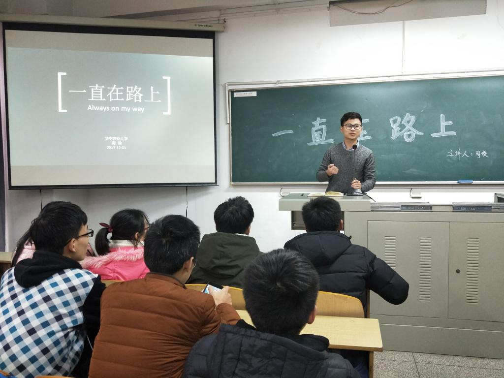 院青年全媒体中心消息(文:闫立松/图:周怀棠) 为引导同学们树立梦想,明确目标,以及帮助同学们大学不留遗憾,17级导学员柳磊同学特从华中农业大学请来优秀员工周俊学长,于12月1号下午4点在科教楼205教室为大一新生举行了“一直在路上”专题讲座。17级辅导员孙静老师出席活动。