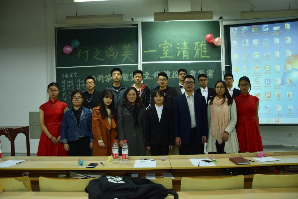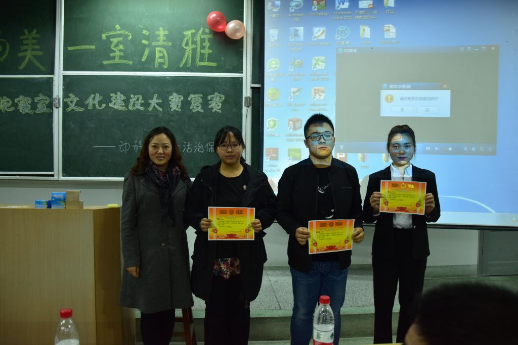 比赛由生活治保部的李怡同学与兰永龙同学主持,本次比赛有十个寝室进入决赛,他们都是经过了初赛选拔出来的优秀寝室。比赛以寝室代表上台运用PPT向大家介绍寝室文化为主,以及各寝室的才艺展示为辅。6418寝室的小提琴演奏优美动听,6420寝室的武术精神抖擞,6406的书法苍劲有力,等等精彩的表演均给大家留下了深刻的印象。在比赛中场的有奖竞答环节,黄帝、刘忠柱等同学凭借着完美的回答得到了由生活治保部准备的丰厚礼品。比赛最后由赵亚梅书记与赵双喜书记分别上台对此次比赛作出了点评,对大家的劳动成果进行了肯定。在经过了激烈的角逐之后,9306寝室最终摘下了桂冠。最后,评委们与参赛寝室的寝室代表合影留念。