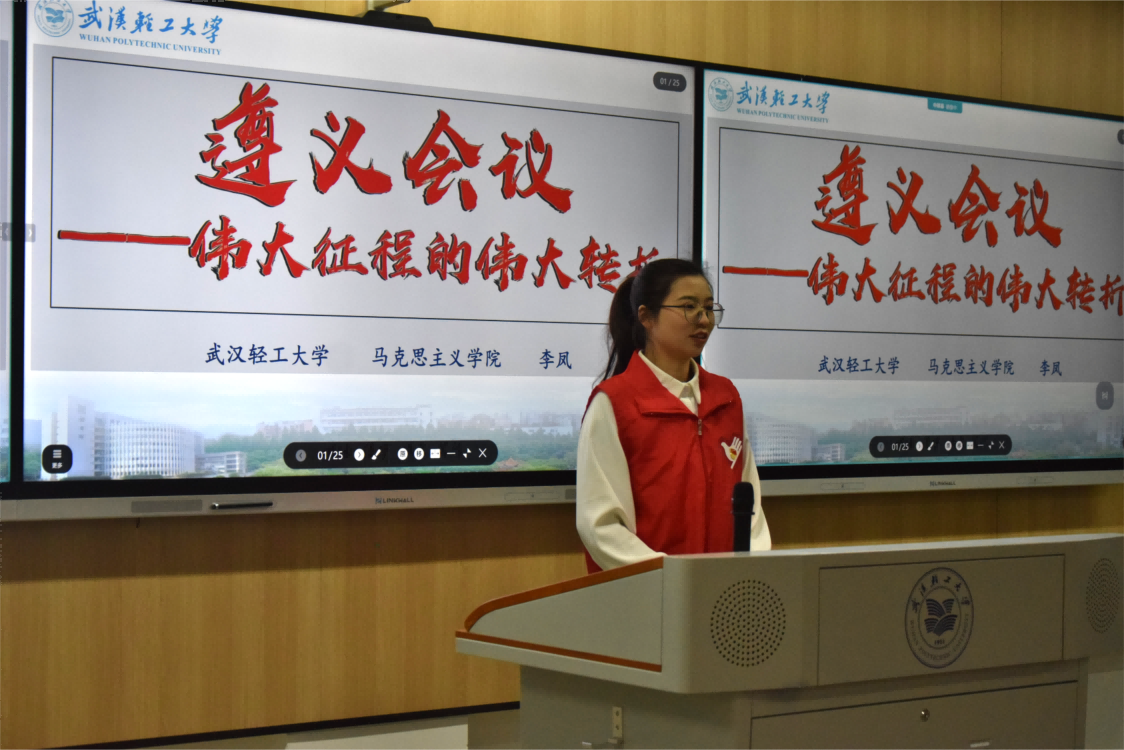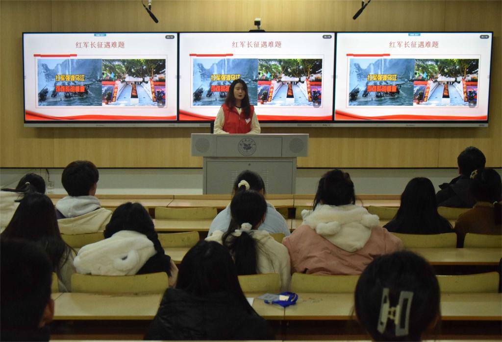 马克思主义公司志愿宣讲团成员李凤为同学们介绍了伟大的历史转折会议——遵义会议,号召同学们学习“坚定信念,坚持真理,独立自主,团结统一”的遵义会议精神,在思想上树立正确的世界观、人生观和价值观,坚定马克思主义信仰,在学习和生活中培养独立思考能力和判断力。马克思主义公司志愿宣讲团成员江喜梅以一把“七星刀”的故事展开,讲述了革命历史时期青年人的奋斗之路,鼓励同学们学习石扬光,做脚踏实地、艰苦奋斗、吃苦耐劳、敢为人先、热爱祖国、热爱人民的新时代青年。