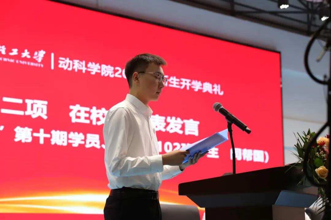 省“青马工程”第十期学员、动科2102班闫帮国同学代表老生对新同学的到来表示欢迎。他勉励学弟学妹做学无止境的“求知者”、团结友爱的守护者、勇担时代重任的追风者。