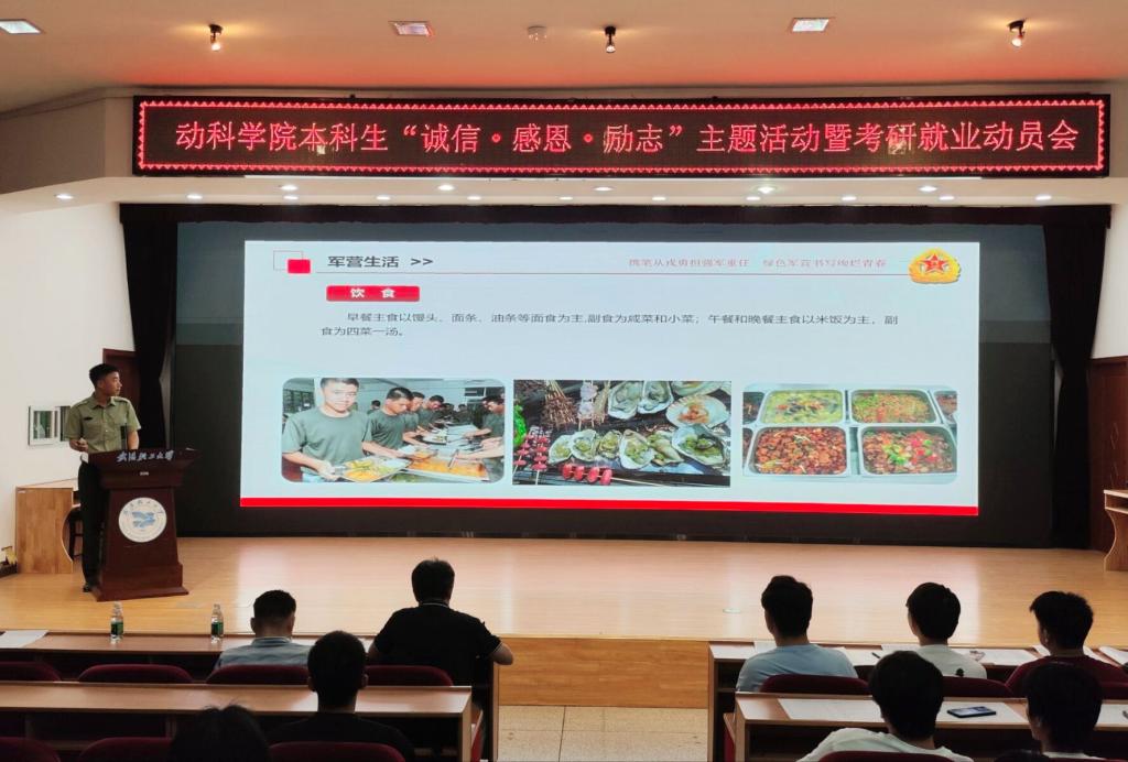 会上,退役老员工士兵、动物科学2102班周远坤同学进行了征兵主题宣讲,号召毕业生到部队建功立业。