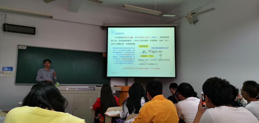 邱老师首先回顾了我国兽医药理学创始人冯琪辉教授的生平和华南农业大学纪念冯先生诞辰一百周年纪念活动,让老师和同学们对我国兽医药理学的历史和重要活动有了更清晰的了解。本次观摩课的主要内容为β-内酰胺类抗生素。邱老师利用他丰富的理论知识和临床实践经验,结合兽医临床实际用药,给大家重点讲述了β-内酰胺类抗生素的作用机理、重点药物、临床使用和用药注意事项。
