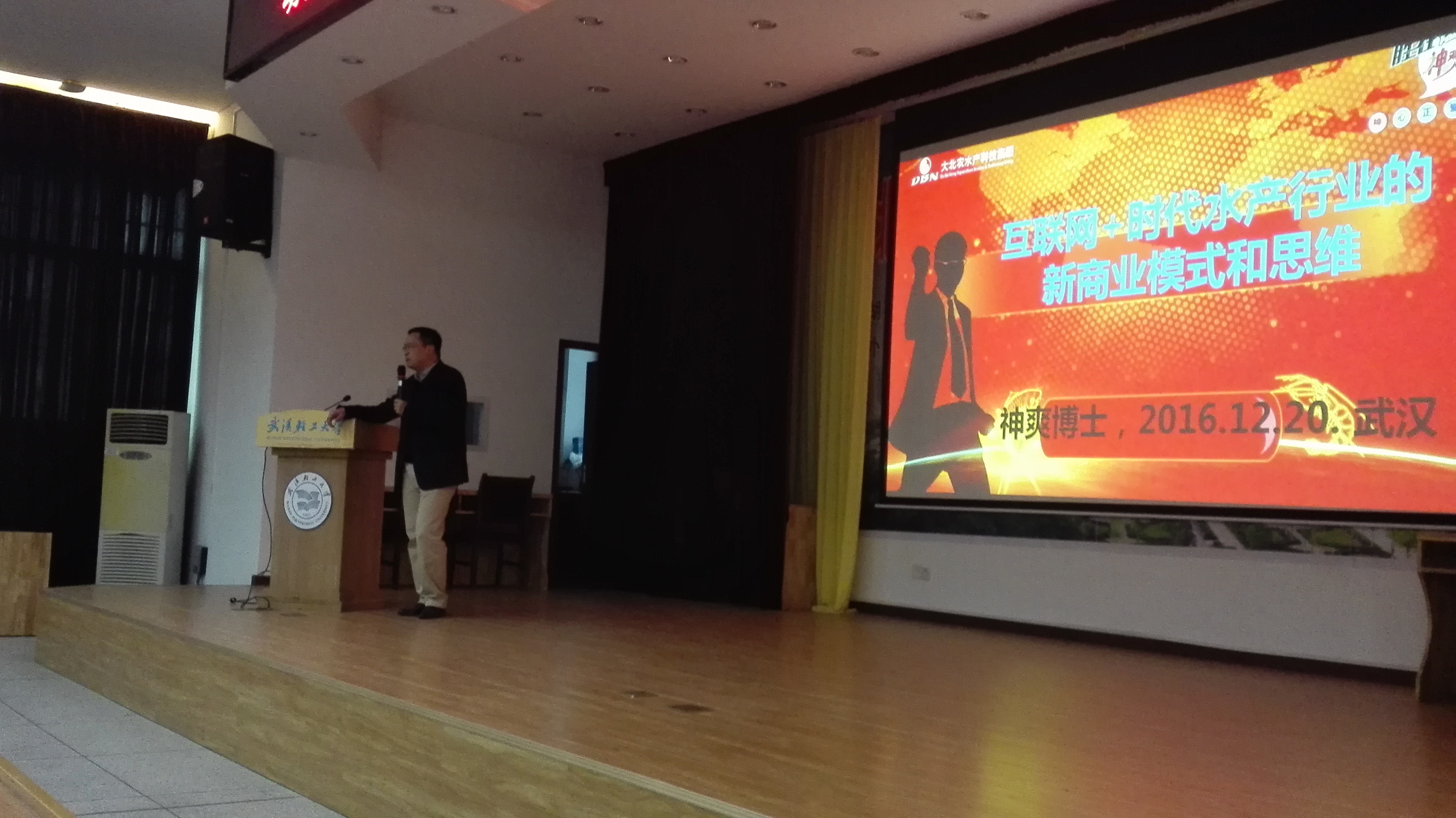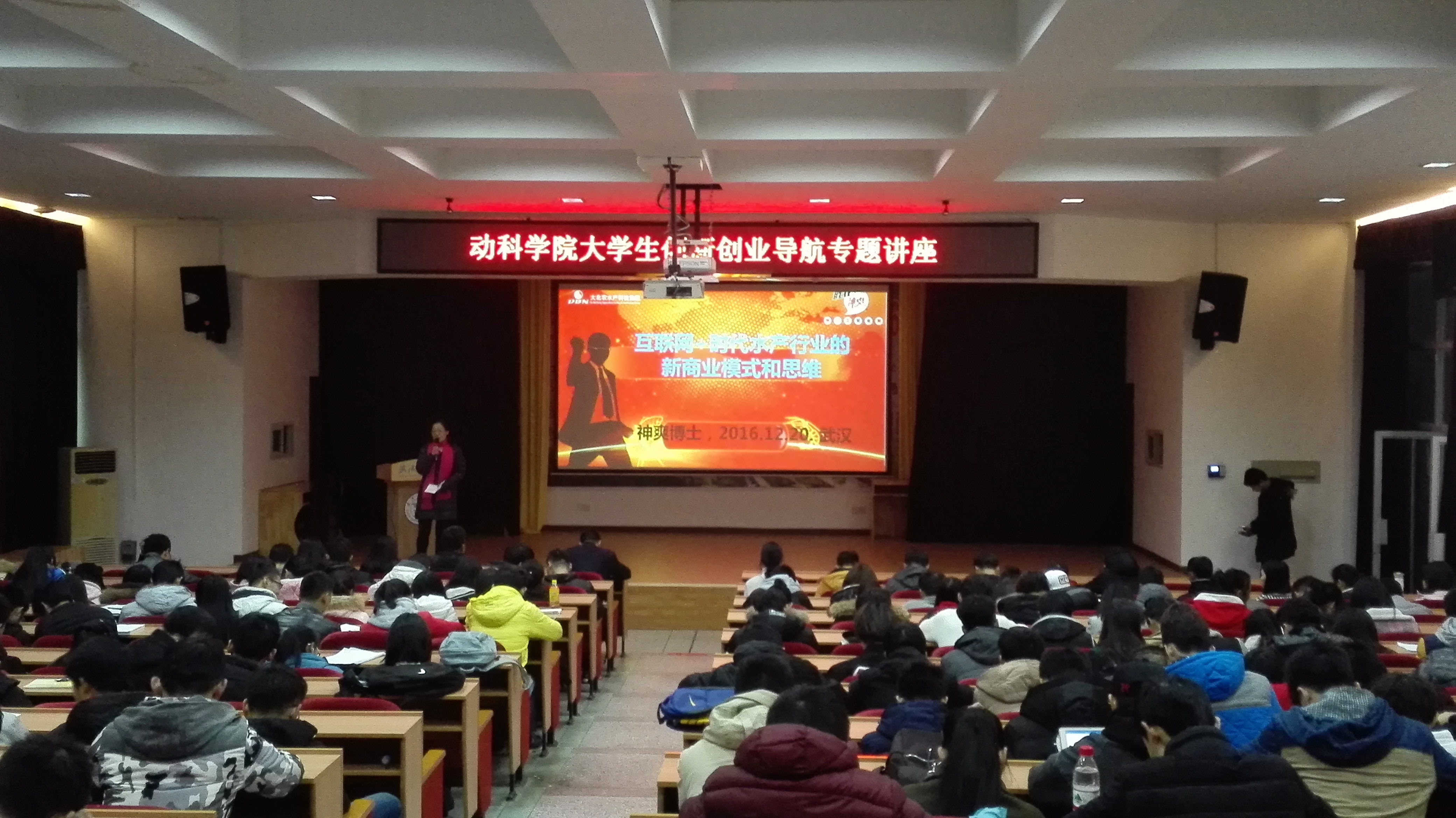 讲座伊始,饶书记代表全院师生对易敢峰博士百忙之中为大家做主题报告表示热烈的欢迎,并希望同学们珍惜机会,认真倾听,汲取课堂以外知识和信息的营养。随后,讲座在一片掌声中开始,首先,易博士讲述了自己的求学经历,从小学到博士,从国内到国外,虽然历经艰辛,但是在这一过程中收获了无穷的知识和坚强的意志。其次,他重点阐释了自己对创新创业的看法。第一,要认清经济发展趋势和了解专业特色,培养创新创业意识,营造敢于开拓的氛围。第二,以介绍大北农企业文化和企业运作模式为契机,详细阐释了在大众创新,万众创业的社会大背景下,要善于并敢于将水产行业和互联网+结合起来,充分发挥收渔贷、渔富宝、渔友圈、渔商城等一系列行业特色产品,从而创建互联网+时代水产行业的新商业模式。最后,易博士告诫同学们虽然身处和平幸福的时代,但是要坚定信念,树立远大理想,做好人生规划;要把握机会,多读书,肯吃苦;要有能量树,做到坚韧不拔,乐观向上。他强调“作为当代老员工,要严于律己,头脑要有详实的知识,脚下要有坚定的脚步,心中要有坚定的梦想”。易博士的讲座丰富而有内涵,语言生动有趣,大家纷纷表示,一定不忘易博士的嘱咐,努力学习,开拓出属于自己的事业花园。