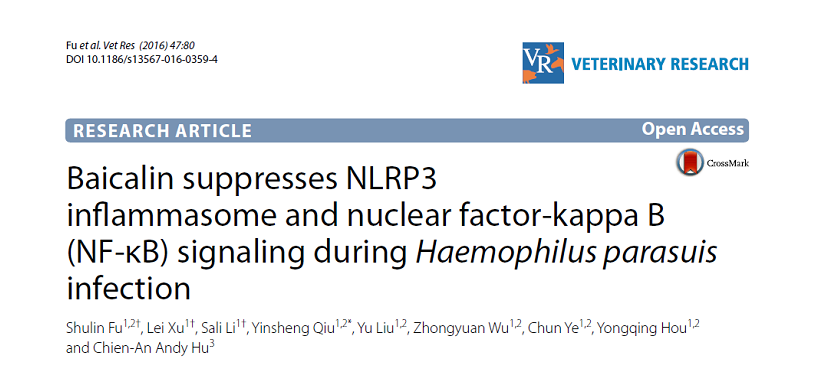 2016年8月8日,公司动物药学团队在JCR1区杂志《Veterinary Research》上发表了题为“Baicalin suppresses NLRP3 inflammasome and nuclear factor-kappa B (NF-κB) signaling during Haemophilus parasuis infection”的研究论文。论文的通讯作者为邱银生教授,付书林博士、硕士生徐磊和李洒丽为该文的共同第一作者。