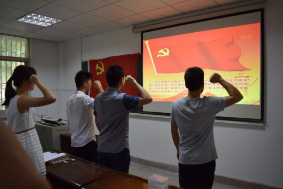 活动开始后,支部党员依次缴纳了本月党费,支部组织委员李鹏对党费进行了清点、通报。伴随着《义勇军进行曲》雄壮的旋律,我们再次感受了中产党人战胜艰难险阻的强大力量,我们的精神深受洗礼,我们的党性得到锤炼。在组织委员李鹏的带领下,两名预备党员和全体党员面向党旗庄严宣誓,重温入党誓词,告诫自己不忘初心,时刻以党员的标准严格要求自己。