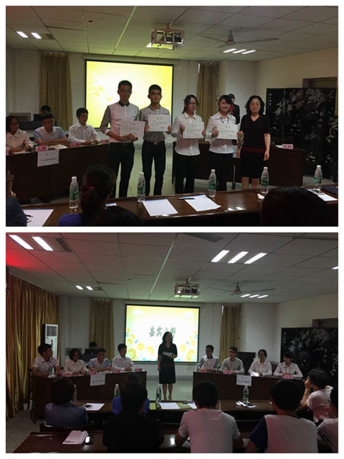 经过评委的评定,反方获胜,正方二辩被评为“最佳辩手”。饶春红为获奖同学颁奖。