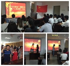 宣誓后,进行了“红色基金”的交接和捐赠。基金负责人向孝君同学介绍,毕业生“红色基金”是由公司2004届毕业生党员自愿发起设立,并由每届毕业生党员自愿交纳的特殊党费设立。基金用于资助院内家庭经济困难的员工,每年进行一次基金的交接,迄今已传承12届。14级的关继松同学获得了本次基金捐赠。他在发言中对全体毕业生党员交纳“特殊党费”的举动表示感谢,并表示,他会在“红色基金”精神的感召下,刻苦学习、努力提升自己,积极向党组织靠拢,用自己的实际行动带给身边同学更多的正能量。