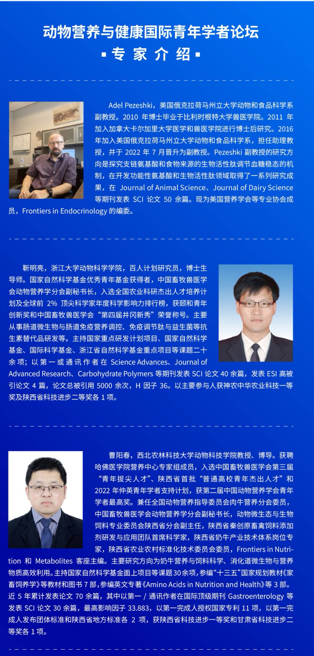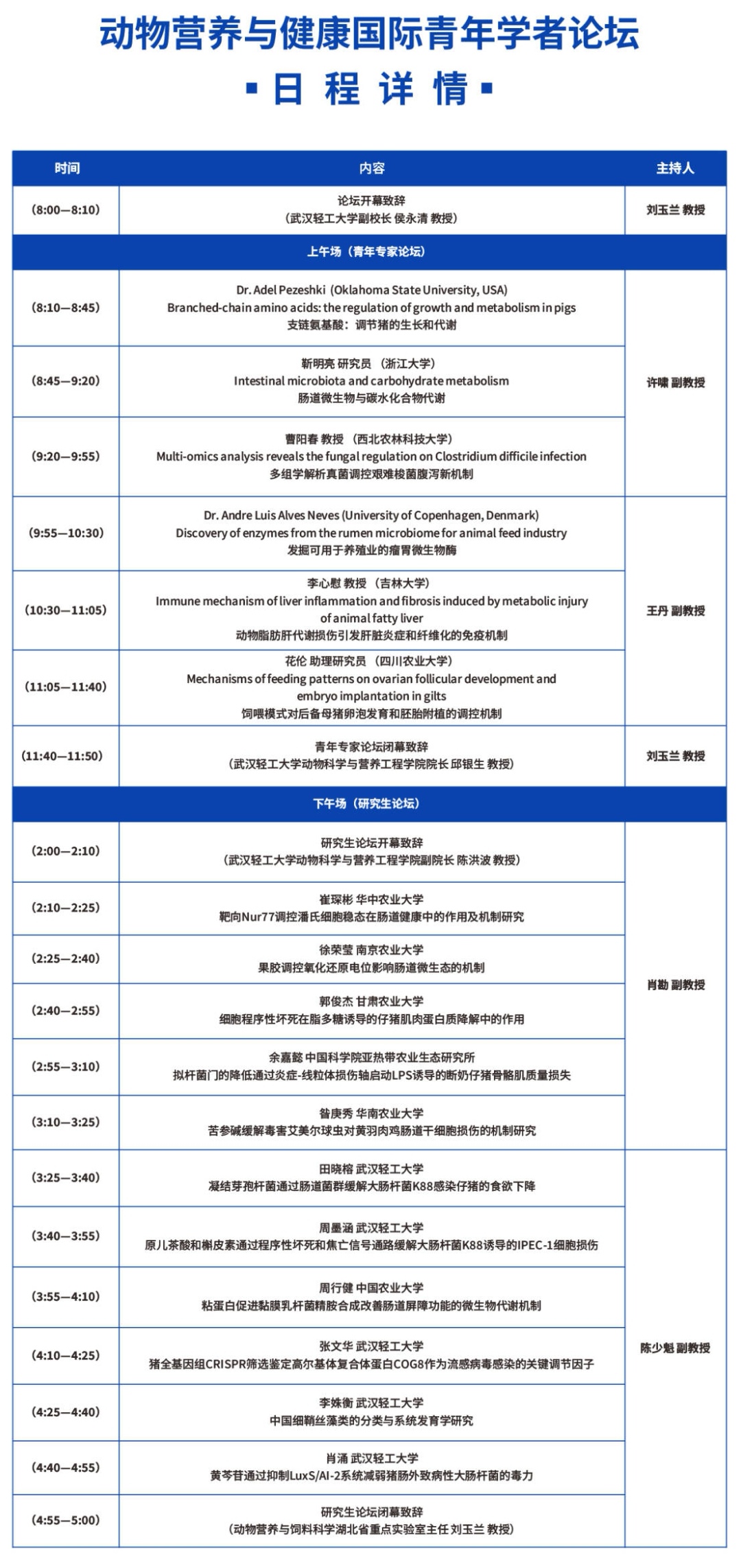 由best365英国体育在线主办,农副产品蛋白质饲料资源教育部工程研究中心、农业部饲料资源与加工科学观测试验站、动物营养与饲料科学湖北省重点实验室等承办的“2023年动物营养与健康国际青年学者论坛”将于2023年12月26日(周二08:00-17:00),以腾讯会议的形式进行(会议号216-164-152)。本次论坛主题为动物营养与健康,主要议题是营养与免疫、营养与肠道健康、肠道微生物、营养代谢病、营养与繁殖、无抗养殖技术等。论坛将邀请来自中国、美国、丹麦等国家知名青年学者进行研讨。欢迎广大师生参加,论坛详情如下: