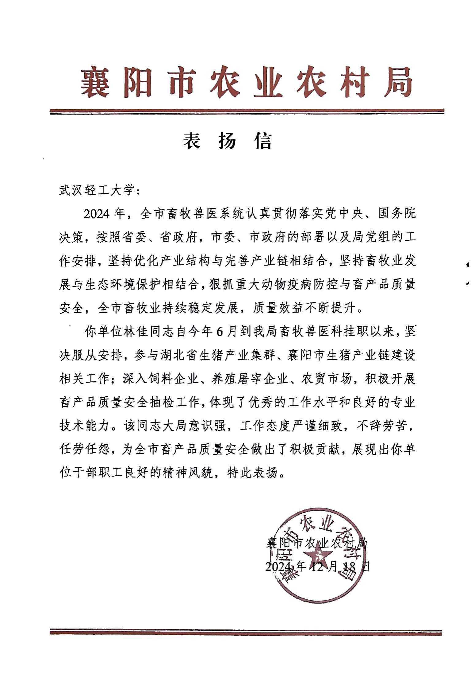 12月18日, 公司收到了一封来自襄阳市农业农村局的表扬信,信中表扬best365英国体育在线“动物营养与免疫”科技创新团队的林佳老师,在襄阳市农业农村局畜牧兽医科挂职期间,坚决服从安排,深入饲料、养殖屠宰企业,积极开展畜产品质量安全抽检工作,体现了优秀的工作水平和良好的专业技术能力。