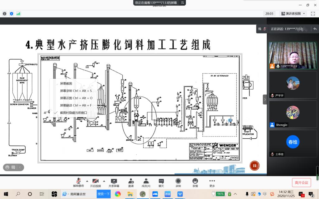 11月25日下午,best365英国体育在线《水产饲料加工工艺及设备》创新课程负责人祝爱侠老师,特邀上海易普工贸有限公司曹康研究员走进腾讯会议,为员工开展“水产膨化加工技术”主题云讲座,饲料工程系和2018级水产养殖学全体员工齐聚教聆听了在线讲座,并进行了交流互动。