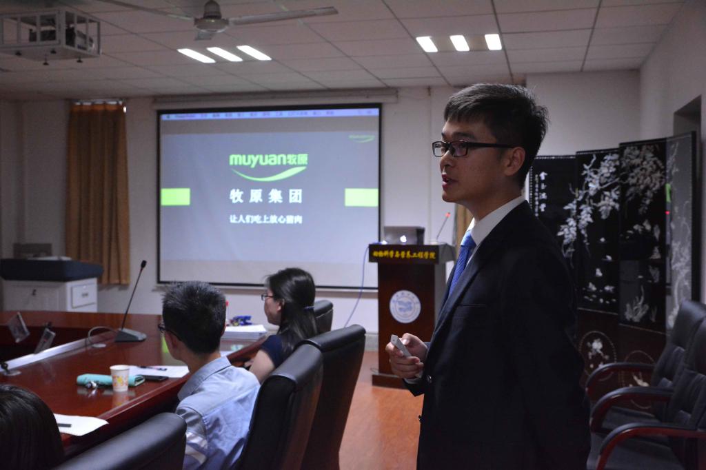 牧原股份有限公司是集饲料加工、养猪生产、屠宰加工为一体的大型现代化农牧企业,其集约化养猪规模居亚洲第一。座谈会一开始,公司人事部代表李垚首先为同学们播放了企业的宣传视频,优秀的企业文化和人才培养机制,使同学对牧原集团产生了浓厚的兴趣。他首先向同学们介绍到牧原集团的目前发展状况,岗位的需求人数,以及今后的工作薪资。过程中他与同学们进行亲密互动,互相提问,同时在提问的过程中也深刻的了解了同学们内心的想法,提醒同学们要开拓思维,大胆创新,敢于突破。最后,牧原集团湖北子公司的生产总监向同学们介绍了工作要求和住宿环境。公司人性化的管理,优越的环境引起了同学们的广泛关注。